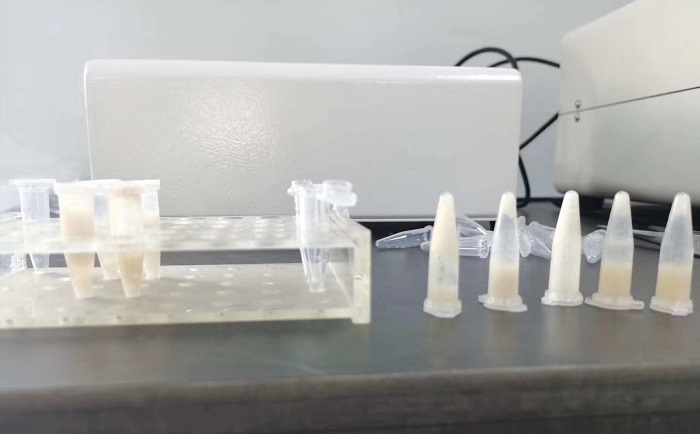 我們先將采集回來的豬肉組織樣品用剪刀剪成碎塊,碎塊大小只要輕松放入離心管即可。將樣品和1-2個(gè)研磨球一起放入離心管適配器中,蓋上蓋子放入研磨平臺(tái)的支架中,然后將研磨平臺(tái)固定在TJG高通量組織研磨儀的夾具上,即可打開機(jī)器進(jìn)行研磨。